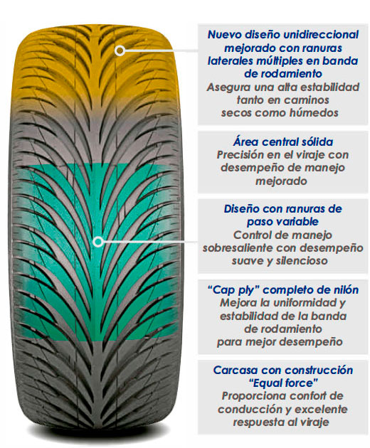 Proporciona amplio kilometraje, buen desempeño en condiciones húmedas, rodaje silencioso y confortable y un excelente manejo.