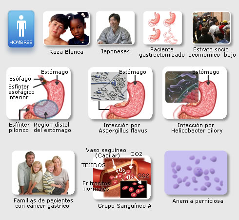 Por otro lado, la relación del cáncer gástrico con el grupo sanguíneo, fue descrita hace varias décadas, permitiendo afirmar que en los pacientes con grupo sanguíneo A se aumenta el riesgo de padecer cáncer gástrico en un 20%. En la anemia perniciosa la atrofia difusa de la mucosa gástrica dispara la frecuencia de cáncer gástrico en los pacientes hasta cinco veces más con relación a la población general.