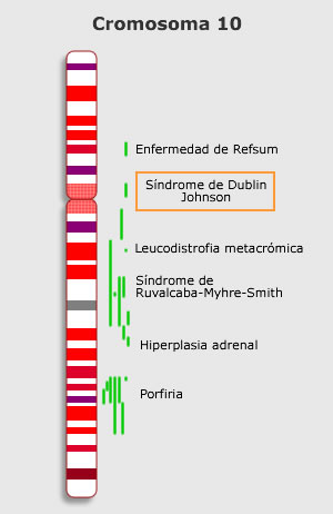 Cromosoma 10: Contiene unos 1400 genes con más de 130 millones de pares de bases. Algunas enfermedades asociadas a mutaciones en el cormosoma 10 son: Hiperplasia adrenal, Síndrome de Dubin-Johnson y Síndrome de Refsum
