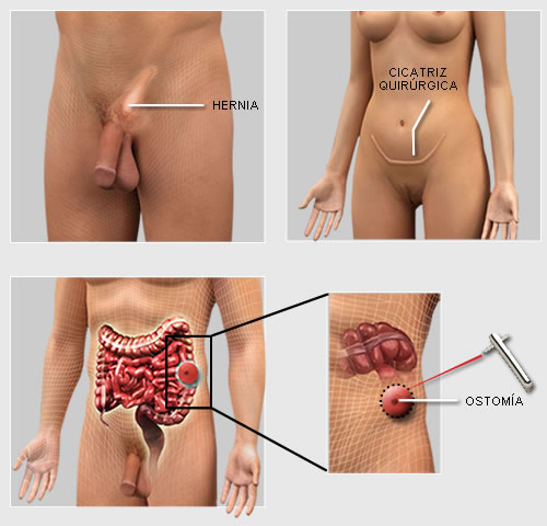 ostomías, masas, hernias, erupciones y equimosis que indiquen trauma, cirugías pasadas o enfermedad actual.