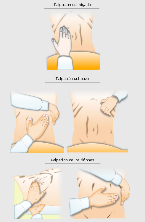 La palpación abdominal se debe iniciar en forma suave, sobre un área donde el paciente haya reportado menos dolor; posteriormente se revisa todo el abdomen. Es importante involucrar al paciente en una conversación durante el examen para distraer su atención en la palpación y conseguir, de esta manera, mayor efectividad en el examen. Se debe percutir y auscultar el abdomen en búsqueda de timpanismo, el cual puede ser secundario a neumoperitoneo difuso, o a una obstrucción intestinal.